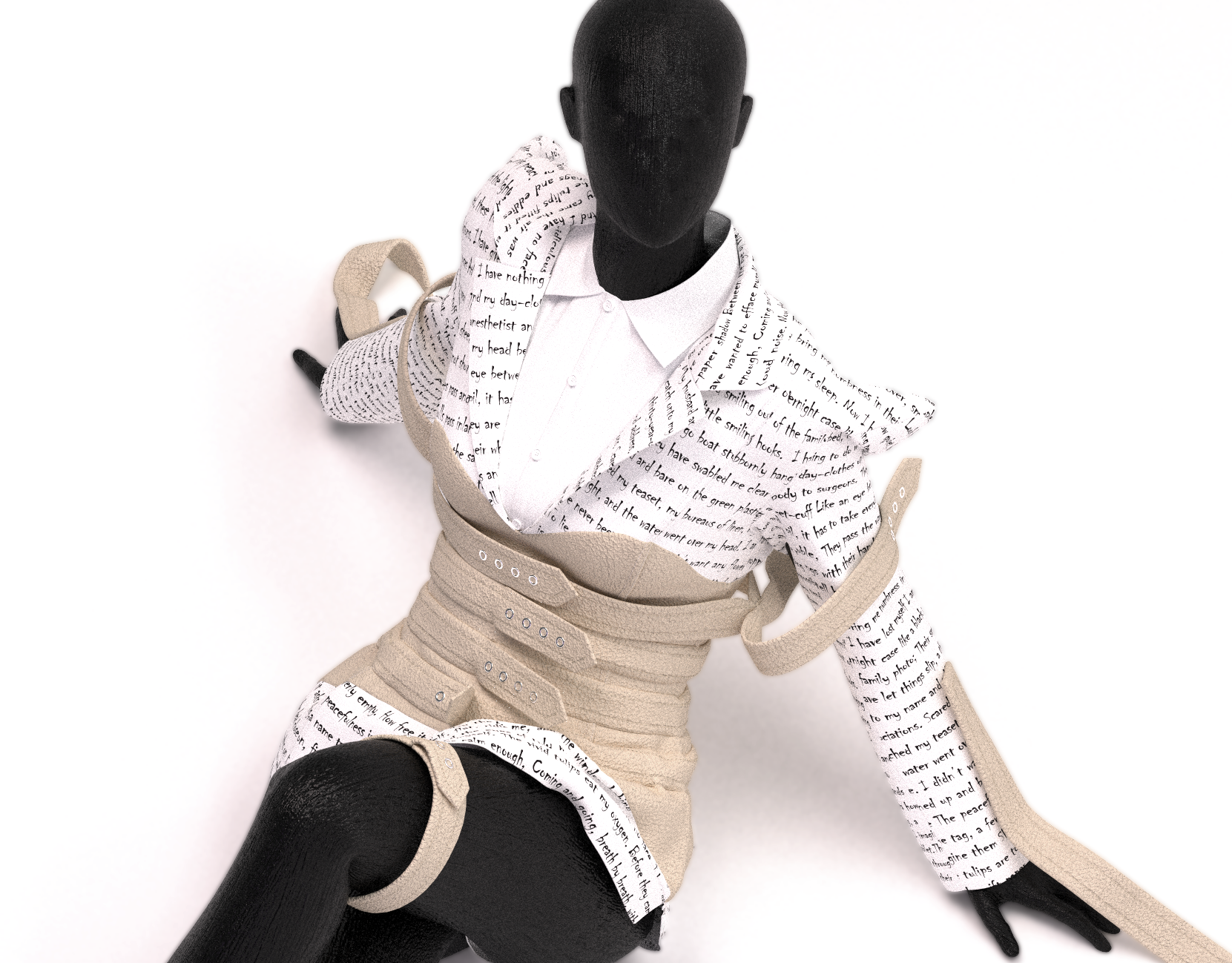 Digitally tailored blazer-corset ensemble in Marvelous Designer, optimized for multi-fabric collision. White jacquard printed with Plath’s Tulips combined with a raw Piñatex corset stabilized by rigid-cloth belts evoking straitjacket mechanics.