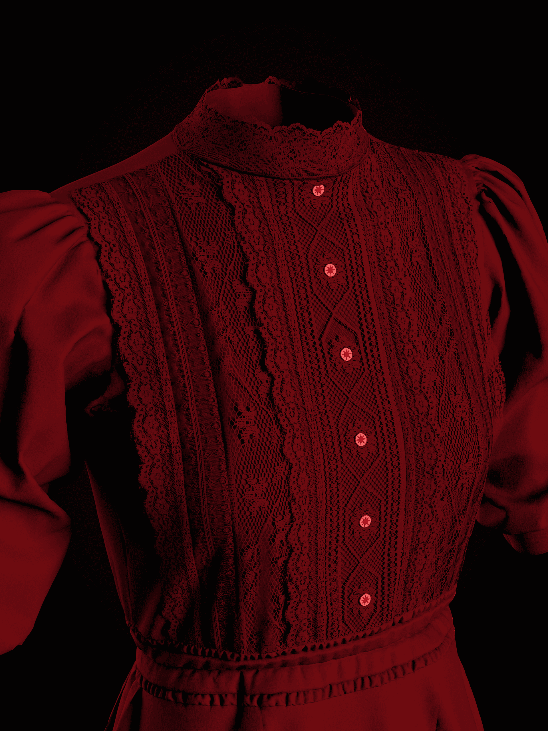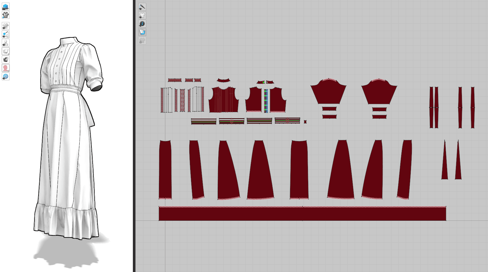 This 3D garment is inspired by the signature dress worn by Mia Goth in Pearl (2022). The dress, originally belonging to Pearl's mother from her youth, is designed in a classic Edwardian style, featuring embroidered details on the bodice and a gathered skirt at the back. The garment was patterned and simulated in CLO 3D, with textures created in Photoshop using hand-modified alphas sourced online. The buttons were modeled and textured in Substance Painter, while the final rendering was also done in CLO 3D.